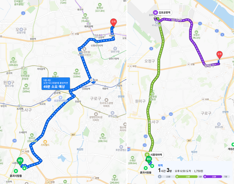 시흥 집에서 두 곳을 비교해 보니 재미있는 차이가 있었습니다. 경기지역대학은 5월 10일 일요일, 서울남부학습센터는 5월 4일 월요일 수업이었죠. 아직 수업의 세부적인 사항이 정해지지 않아서 출발 시간을 9시로 정하여 지도를 검색했더니, 월요일 수업인 서울남부는 출근길 정체를 고려해야 했고, 일요일의 경기는 주말 나들이 인파를 감안해야 했습니다.