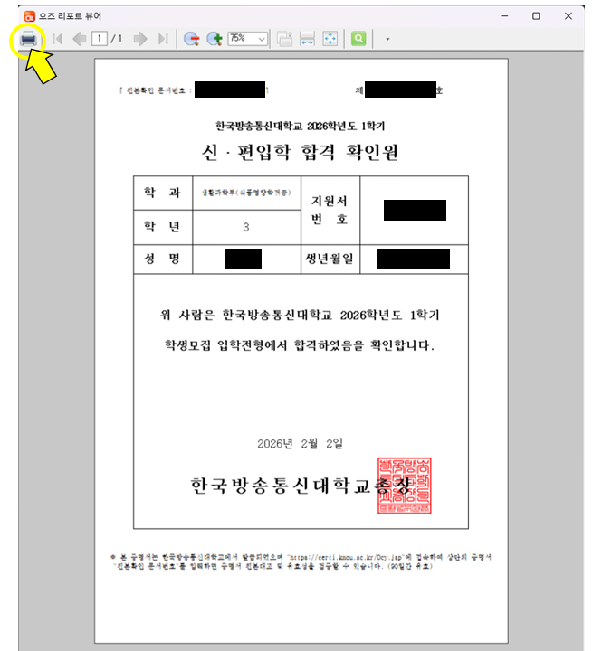신·편입학 합격 확인원이 뷰어에 뜨면 왼쪽 상단의 프린트 모양을 클릭합니다. 인증시에는 생년월일만 가리고 제출합니다.